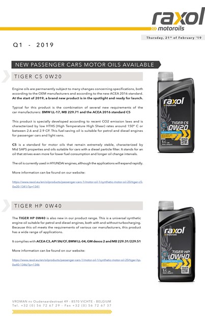 Les huiles moteur sont soumises en permanence à de nombreuses modifications et spécifications, à la fois selon les normes OEM et ACEA 2016. Début 2019, un tout nouveau produit est à l’honneur et prêt à être lancé, le TIGER C5 0W20. La combinaison de plusieurs exigences des constructeurs automobiles est typique de ce produit: BMW LL-17, MB 229.71 et la norme ACEA 2016 C5.